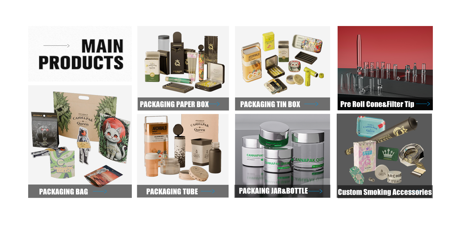 Prodotti principali: Cartine, coni Pre laminati, imballaggi Pre-Roll, imballaggi resistenti ai bambini, sacchetti Mylar